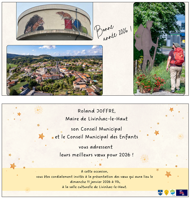 À l’occasion de la nouvelle année, la municipalité de Livinhac-le-Haut vous adresse ses meilleurs vœux et a le plaisir de vous inviter à la cérémonie des vœux qui se tiendra dimanche 11 janvier 2026 à 11h, à la salle culturelle, suivie du pot de l’amitié.